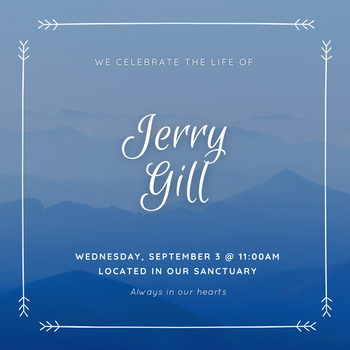 Longtime First UMC member, Jerry Gill, passed away on Friday, Aug. 22. His celebration of life service will be held on Wednesday, September 3, at 11:00 am in our Sanctuary. The service will also be livestreamed on our YouTube channel.