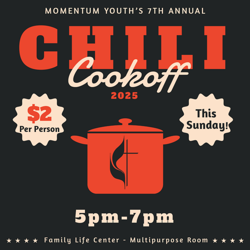 | Momentum Youth’s 7th Annual Chili Cook-off is THIS SUNDAY, January 26, 5:00-7:00pm! $2 a person at the door gets you a full chili dinner, as well as an opportunity to taste the entries. Enter YOUR favorite chili by signing up HERE or contact Janelda Lane at jlane@fumcstw.org |