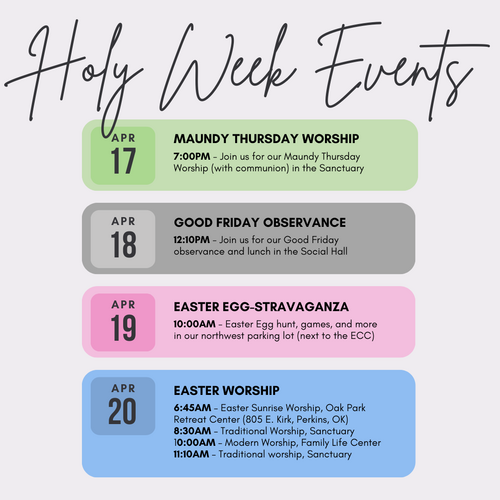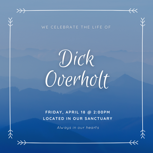 The memorial service for long-time First UMC member, Dick Overholt, will be on Good Friday, April 18, at 2pm in the Sanctuary. We pray for God's joy and peace for his family and friends during this time.