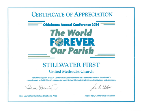 Best definition I’ve ever heard for apportionments — “a portion meant for others.” We are asked to give back 10% of our revenue to support the work of the Annual Conference and the United Methodist Church around the world. Yes, those dollars pay salaries and keep the lights on at the Conference Office; but, they also mean I received a phone call the day after the wildfires assuring me that a check was in the mail to help us help those most affected.
