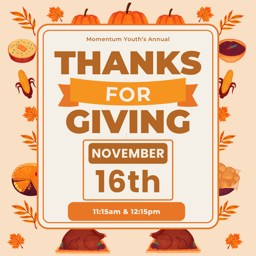 Sunday, November 16th is Momentum Youth’s Annual Thanks-for-Giving Meal and Dessert Auction. Mark your calendars to attend either the 11:15am or 12:15pm seating.