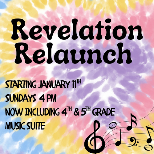 - Revelation Youth Choir will now accept 4th through 12th graders, rehearsing Sunday evenings from 4:00-5:00pm. Rehearsals resume Jan. 11th.