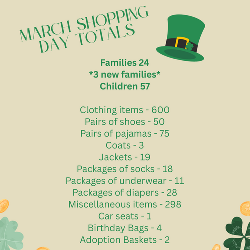 Over the next few weeks, our volunteers will be hard at work transitioning all of our winter clothing to summer clothing. There’s always a bit of magic that happens behind the scenes as we prepare for our April shopping days, and we’re grateful for every helping hand that makes it possible.