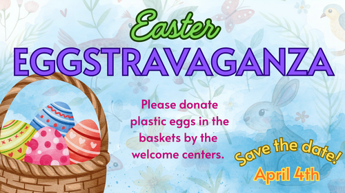 Our annual Community Easter Eggstravaganza is hopping closer, and we need your help to make it egg-straordinary! Please donate plastic Easter eggs in the baskets by the welcome desks and spread some egg-streme joy throughout our community.